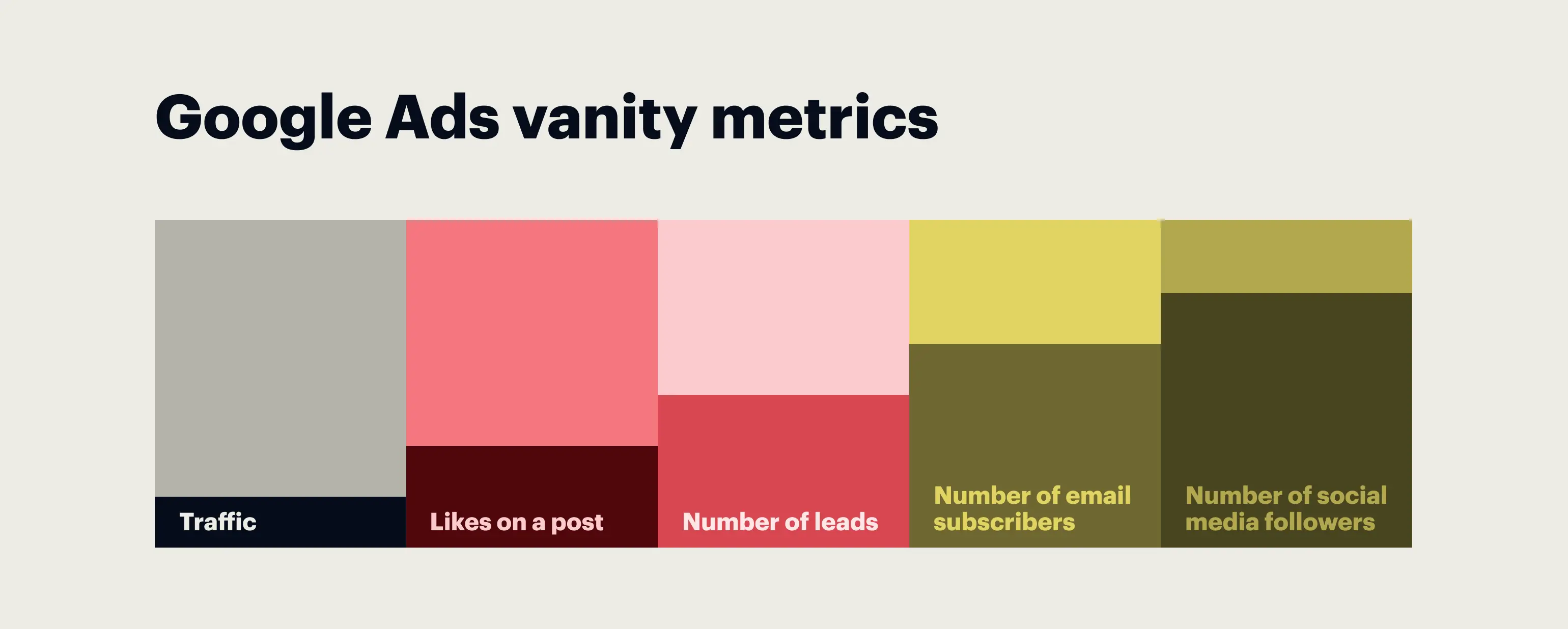 Vanity metrics can be measured and may be of interest to you, but ultimately have no significant effect on ROI or ROAS. Examples of vanity metrics include: