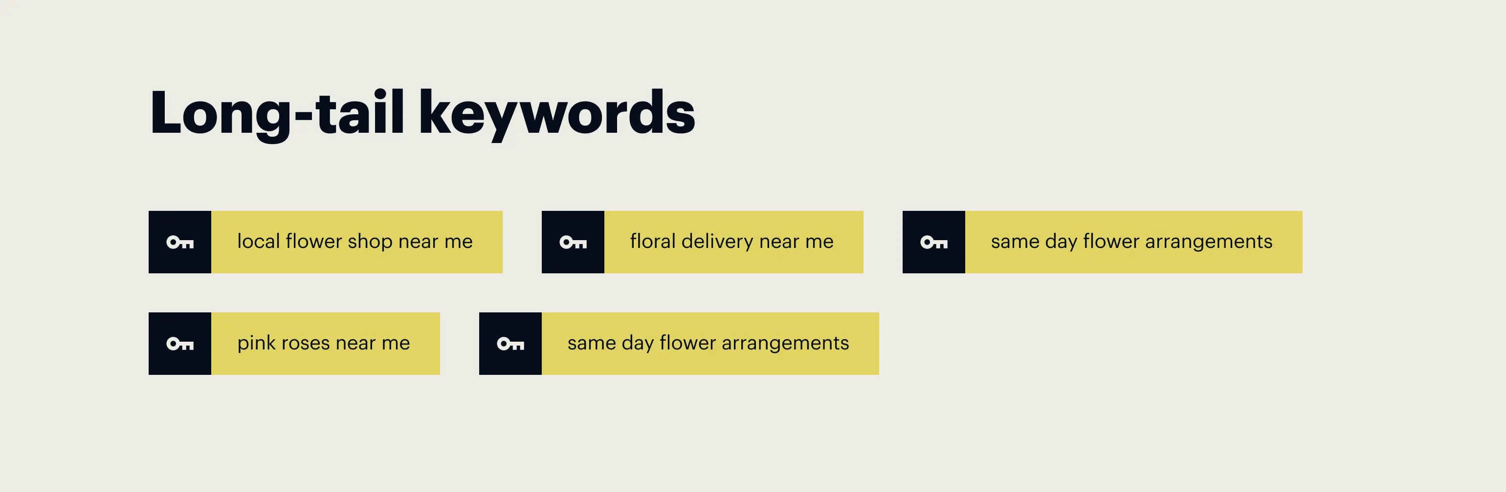 Our flower shop in the example above would probably want to include long-tail keywords like “local flower shop near me”, “floral delivery near me”, “same day flower arrangements”, “Mother’s Day flowers near me”, “pink roses near me” and so on.