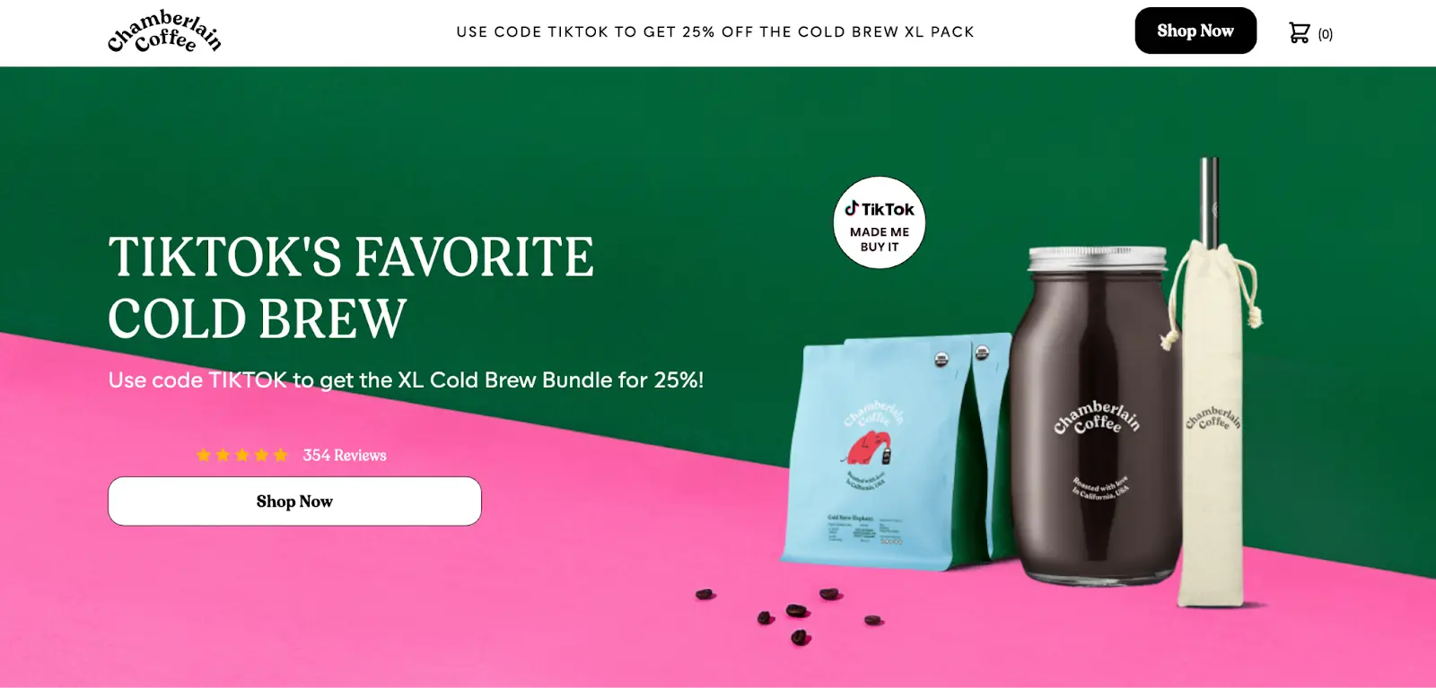 Chamberlain Coffee is geared towards younger audiences. They reference that they are “TikTok’s favorite cold brew,” feature user-generated content made by younger customers, and have messaging on the page made for younger females.