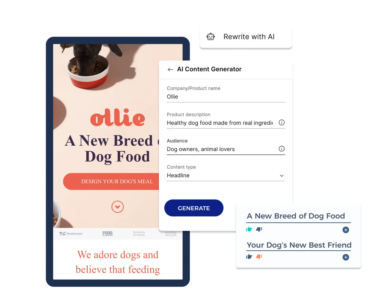 - Generated copy variations for headlines, paragraphs, and CTAs with AI