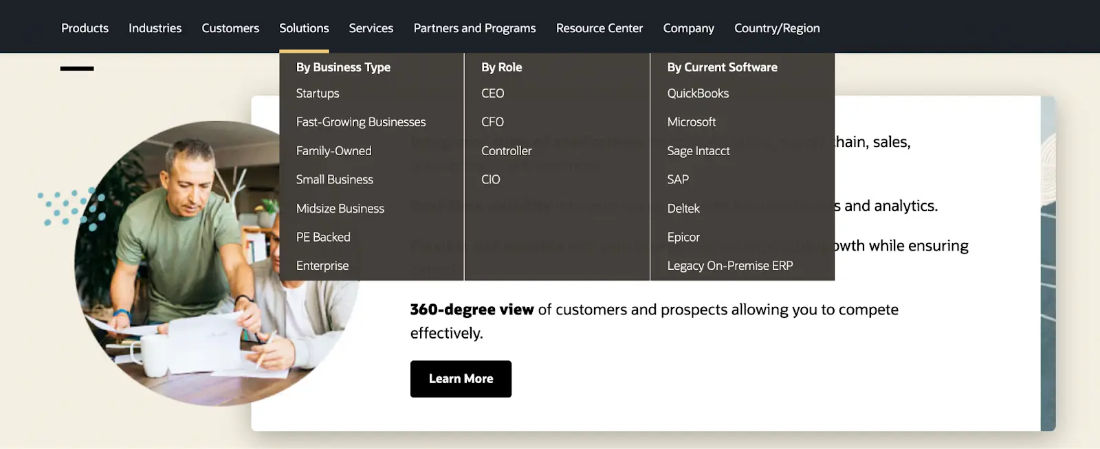 Let’s look at demographic segmentation in action. NetSuite is an accounting platform that targets large enterprises, small businesses, startups, and other businesses. It even dissects its audiences by role. The platform uses different messaging for all these segments, making sure the features it advertises match their individual needs.