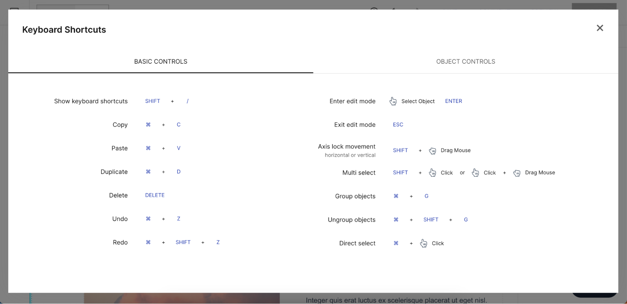 - Google Fonts: The full suite of available typefaces from Google Fonts makes it easy to maintain brand consistency across your pages. Keyboard shortcuts: The inclusion of keyboard shortcuts for common tasks that streamlines the design process, allowing you to add, delete, group, and layer objects with just a few keystrokes. Here’s a look at just a few of the 30 actions we’ve created shortcuts for: