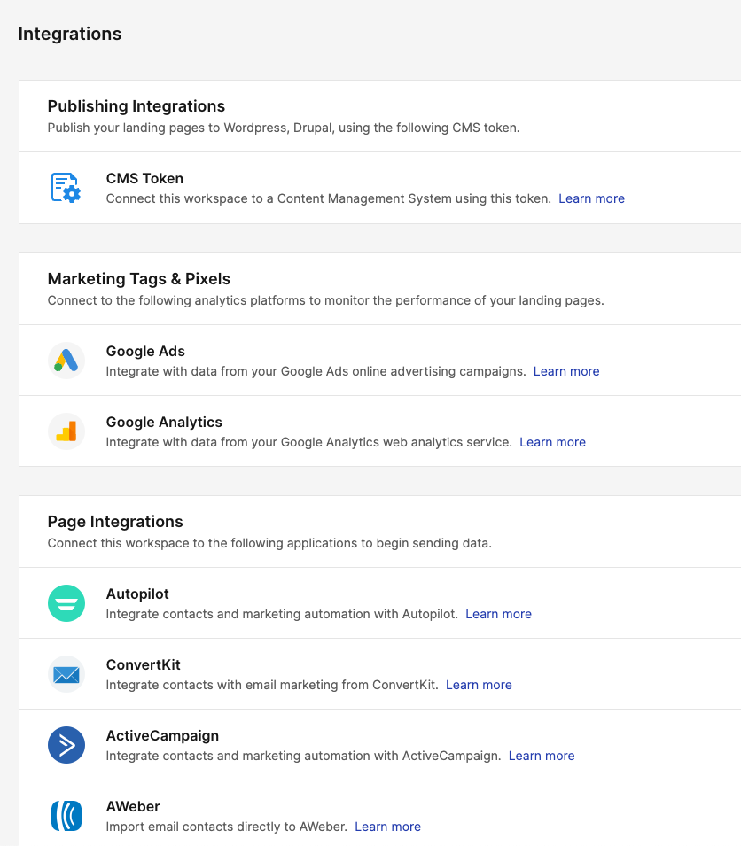 The first step, before publishing a page or inviting team members to test the software, is to make sure all of your tools are connected and ready to process the data from Instapage.